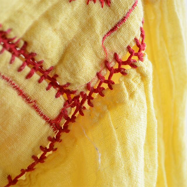 目が粗く柔らかな平織の生地、花の刺繍、絞ることが可能な袖口などがポイント。