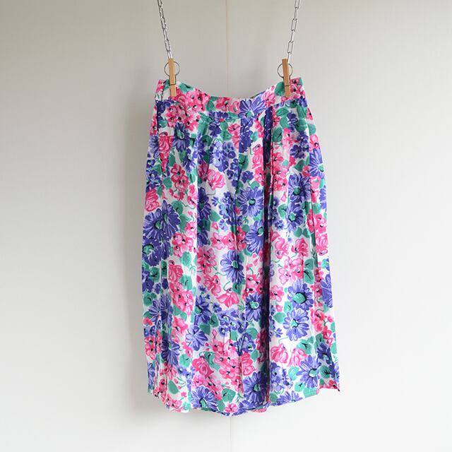 80s、USA製の花柄ギャザースカートです。 素材:100%RAYON SIZE 8(W26相当) ウエスト 67cm 脇丈 67cm 多少の誤差はご了承ください。 CONDITION 着用感はありますが、目立った汚れやダメージはなく、概ね状態良好です。
