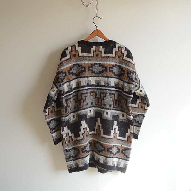 長めの丈、幾何学模様、くるみボタンなどが特徴。