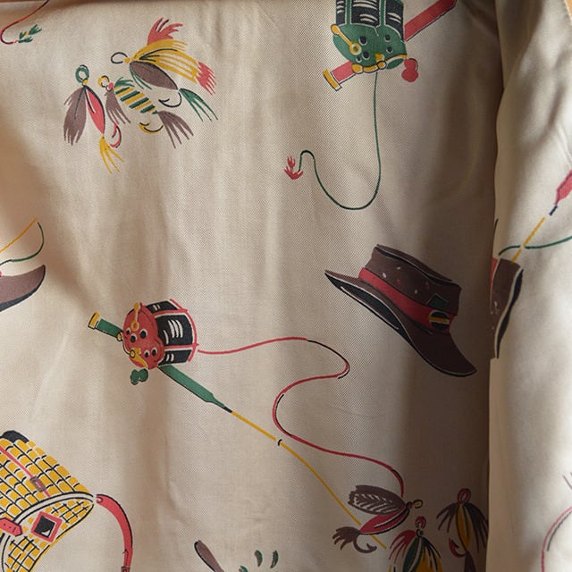 裏地はレーヨン、ビンテージ感漂う毛鉤の総柄プリント。
