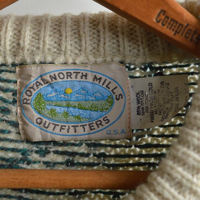 雪柄のような幾何学模様の総柄のウールセーターです。