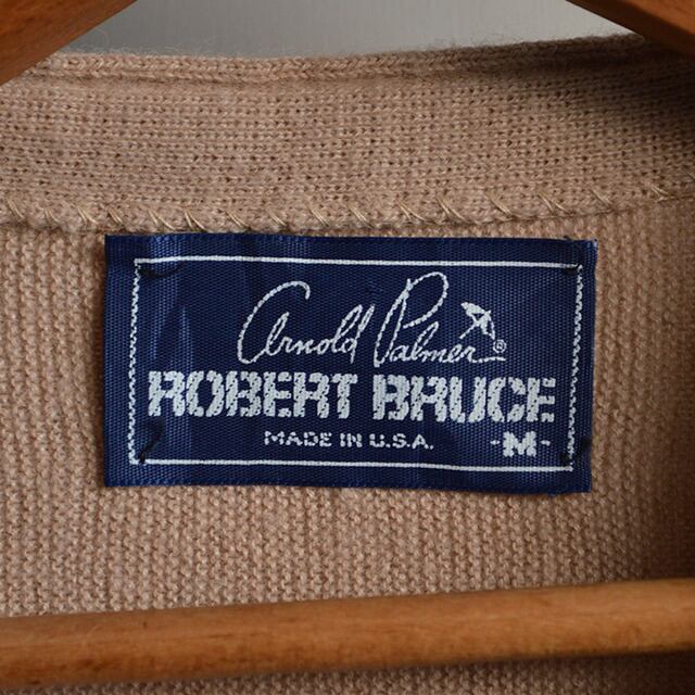 アーノルドパーマーのニットカーディガンです。 80sのUSA製。 ボタンはロゴ入り、ユニオンチケットあり。 色は扱いやすいベージュで生地の厚みはほどほど。 コーディネートを選ばないスタンダードな一着です。 SIZE M 着丈 57cm 身幅 55cm 肩幅 48cm 袖丈 63cm 多少の誤差はご了承ください。 CONDITION 多少の着用感はありますが、目立った汚れやダメージはなく、概ね状態良好です。
