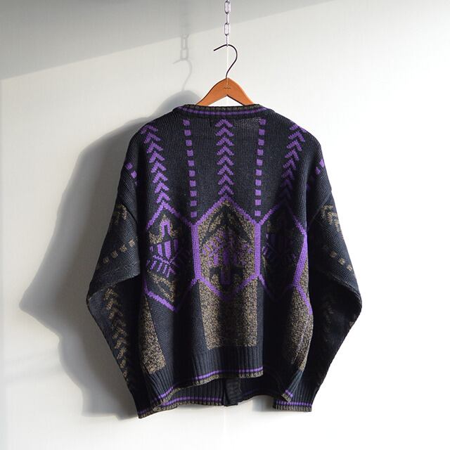 80sのニットカーディガンです。 黒ベースの幾何学模様に身幅広めのビッグシルエット。 この年代のニットとしては合せやすいタイプです。 100%ACRYLIC SIZE S(表記の割に大きめ) 着丈 55cm 身幅 58cm 肩幅 55cm 袖丈 52cm 多少の誤差はご了承ください。 CONDITION 着用感は少なく、目立った汚れやダメージもない良い状態です。