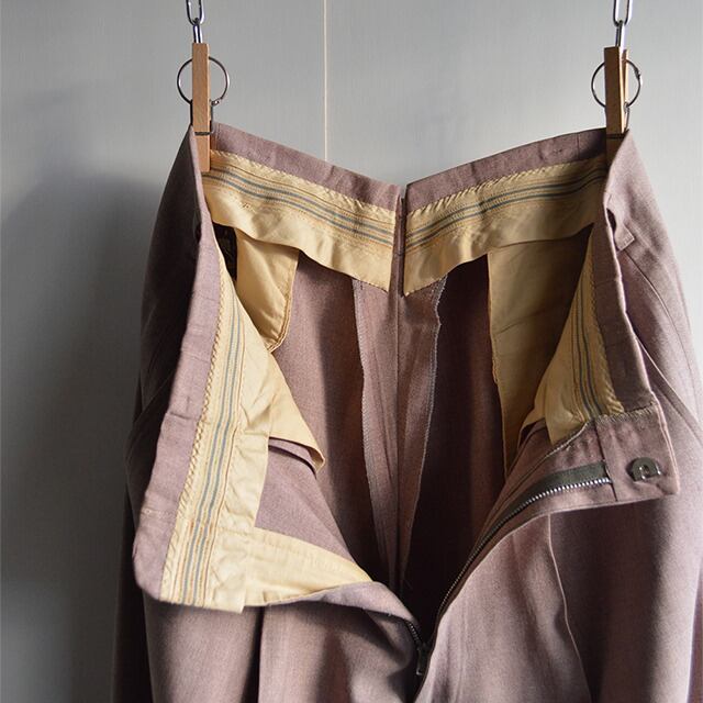 50sのスラックスです。 サイドステッチにちょびフラ、タックと並んだ斜めポケットが特徴。 タグデザインも秀逸です。 ジッパーはTALON。 SIZE 表記なし(W30相当) ウエスト 78cm 脇丈 101cm 股上 31cm 股下 75cm 腿幅 37cm 裾幅 23cm 多少の誤差はご了承ください。 CONDITION 色に斑があり、薄いシミがいくつかあります。 着用感はそれほどなく、年代を考慮すると概ね状態良好です。