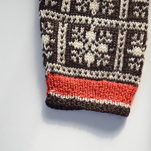 生地は厚め、ブラウン、レッド、ベージュの調和のとれた配色も特徴です。
