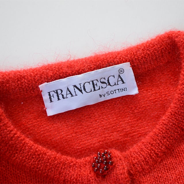 珍しいモヘア素材のニットブラウスです。 イタリア製、80sのヨーロッパ古着。 パフスリーブ、ビーズのデコレーション、広がった裾、長い袖リブなどが特徴的。 薄手のカーディガン感覚でも着れると思います。 素材:80%MOHAIR 15%NYLON 5%WOOL SIZE M 着丈 69cm 身幅 47cm 肩幅 35cm 袖丈 65cm 多少の誤差はご了承ください。 CONDITION 着用感は少なく、目立った汚れやダメージもない良い状態です。