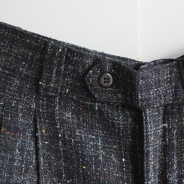 生地はネップ入りのツイード、太ももの前側にのみ裏地付き。