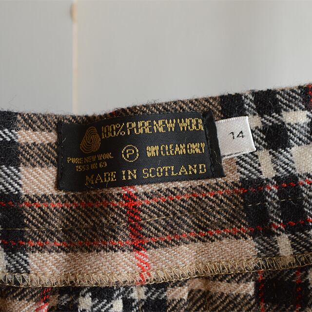 スコットランド製のキルトスカートです。 タータンチェックにレザーベルト付き、生地はウールのトラディショナルな一着。 年代の詳細は不明です。 素材:100%PURE NEW WOOL SIZE UK14(着用感レディースL相当) ウエスト 72-76cm 脇丈 42cm 多少の誤差はご了承ください。 CONDITION シワが付いており、着用感もありますが、目立った汚れやダメージはなく、概ね状態良好です。