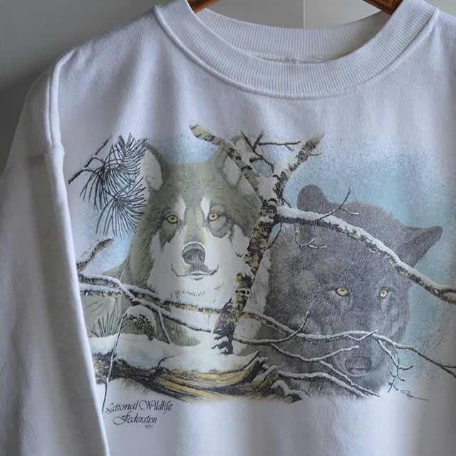 80sのプリントスウェットです。 迫力のある犬柄。 ボディはヘインズのUSA製です。 50%COTTON 50%POLYESTER SIZE L 42-44 着丈 56cm 身幅 56cm 肩幅 52cm 袖丈 55cm 多少の誤差はご了承ください。 CONDITION 腹部、腰、袖など、所々に薄い汚れやシミがあり、右袖には小穴が2つあります。 着用感はありますが、古着慣れしている方でしたら問題なく着れる状態です。