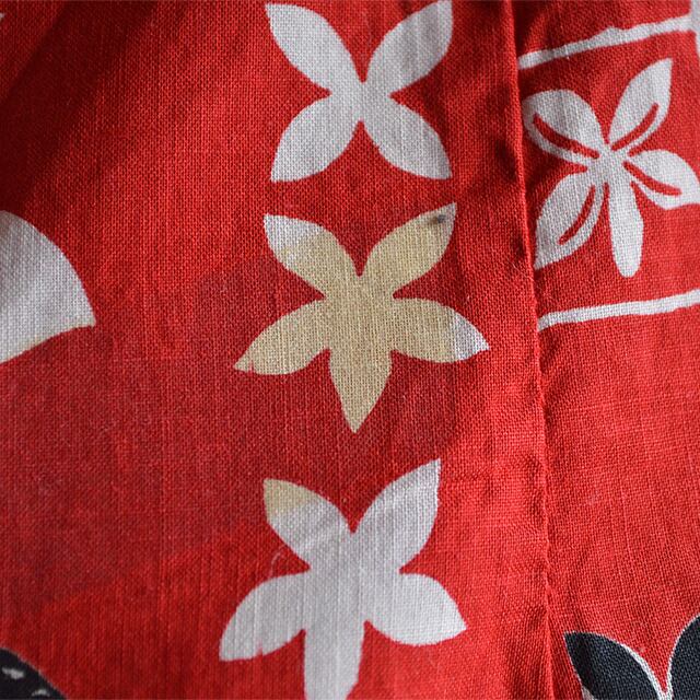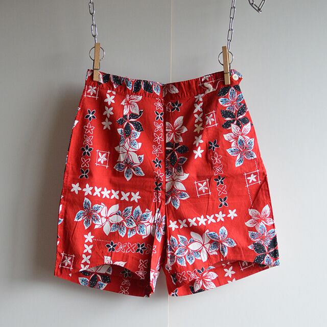 赤ベースに白と黒のハイビスカスのプリントが映える50sのハワイアンショーツです。