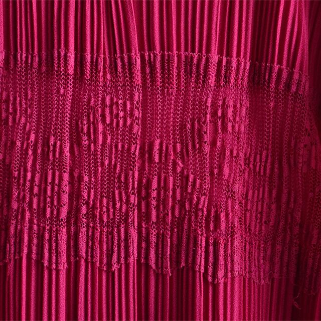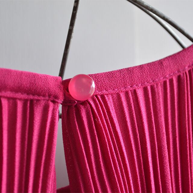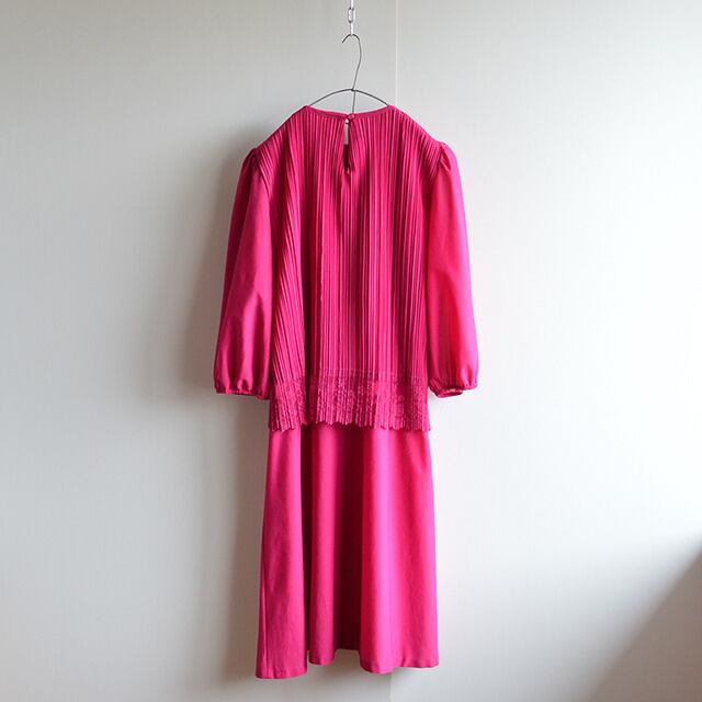 80sのワンピースです。 プリーツ、レースの生地が被せられた、ツーピースに見えるようなデザイン。 生地は柔らかく動きのあるものが使われております。 その他、USA製、ノーカラーというのもポイントです。 SIZE 10(着用感レディースL相当) 着丈 100cm 身幅 48cm 肩幅 35cm 袖丈 45cm 多少の誤差はご了承ください。 CONDITION 軽いほつれ、引っ掛け傷はありますが、着用感の少ない良い状態です。