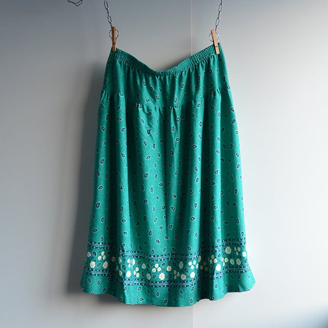 70s、80s頃のバンダナ柄ロングスカートです。 ペイズリーに花の組み合わせ。 生地はTシャツタイプでウエストはゴム入り。 気軽に穿ける一着です。 50%POLYESTER 50%COTTON SIZE SIZE 22W(着用感レディースXL相当) ウエスト《ゴム入り》 82cm 脇丈 80cm 多少の誤差はご了承ください。 CONDITION 着用感は少なく、目立った汚れやダメージもない良い状態です。