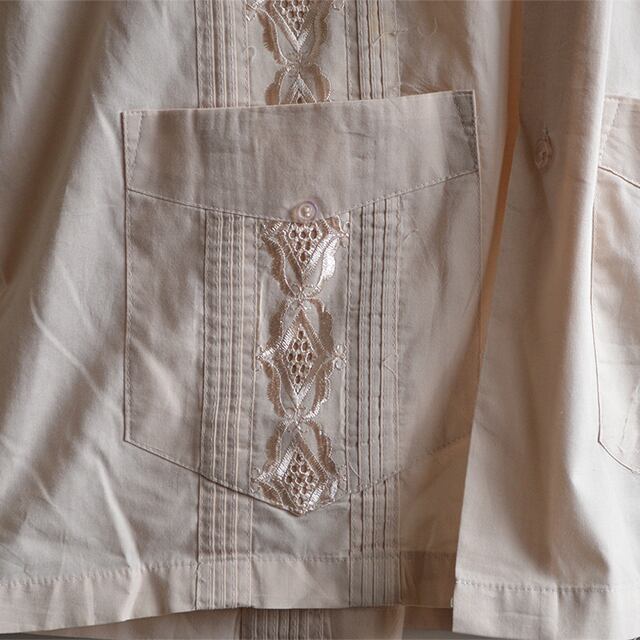 80sのガヤベラシャツです。 四つポケットに刺繍のクラシックなタイプ。 オープンカラーです。 65%POLYESTER 35%COTTON SIZE M(表記の割に大きめ) 着丈 75cm 身幅 55cm 肩幅 50cm 袖丈 23cm 多少の誤差はご了承ください。 CONDITION トップボタンが欠損しておりますが、簡単にリペアしていただけると思います。 襟芯が割れており、多少の着用感もありますが、問題なく着れる状態です。