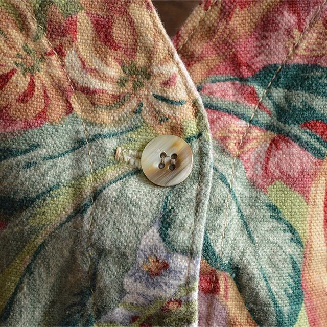 80sの花柄ベストです。 ポケットはフェイク。 貝ではありませんが、似たような柄のボタンが付いており、嬉しいUSA製です。 96%COTTON 4%FLAX SIZE M 着丈 50cm 身幅 50cm 肩幅 36cm 多少の誤差はご了承ください。 CONDITION 多少の着用感はありますが、目立った汚れやダメージはなく、状態良好です。