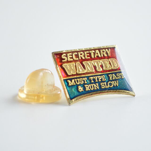 SECRETARY WANTED MUST TYPE FAST & RUN SLOWというメッセージが印象的なピンバッジです。