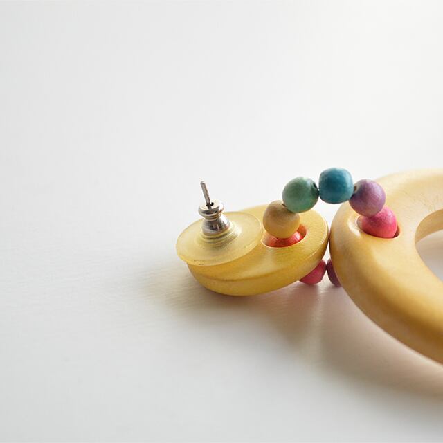 ポップな配色がかわいいウッドピアスです。 80sのアイテム。 リングが大きめでボリュームもあります。 SIZE 縦幅 7.5cm 横幅 4.8cm 多少の誤差はご了承ください。 CONDITION 薄い汚れはありますが、目立つ汚れやダメージはなく、 ヴィンテージアクセサリーらしい雰囲気のある良い状態です。
