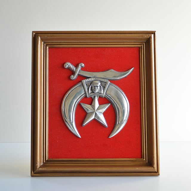 60s頃のフリーメイソン、シュライナーの壁掛けです。 赤の部分はベロアかベルベット。 専用のフレームは木。 エンブレムは金属ですが詳細不明です。 SIZE H 38.5cm W 33.5cm D 3cm 多少の誤差はご了承ください。 CONDITION 細々した汚れや傷みはありますが、状態は良好です。