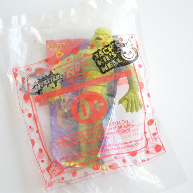 アメリカの人気ハンバーガーチェーン、ジャック・イン・ザ・ボックスのノベルティです。 モンスターズのフランケン、ドラキュラ、マミー、ファントム、半魚人、狼男、6体全て揃っています。 CONDITION 袋が傷んでおりますが、一つを除き全て未開封です。 中の細かいチャックはできませんが、特に問題はなさそうです。