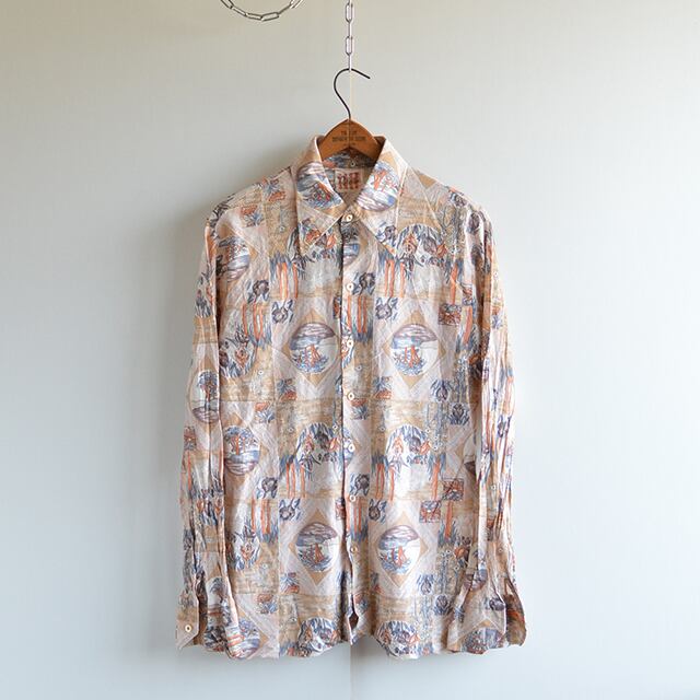 70sの花柄ポリシャツです。 SIZE L(表記の割に小さめ) 着丈 71cm 身幅 47cm 肩幅 42cm 袖丈 61cm 多少の誤差はご了承ください。 CONDITION ポリシャツ特有のシワが目立ち、ある程度の着用感もありますが、大きな傷みはなく、問題なく着れる状態です。