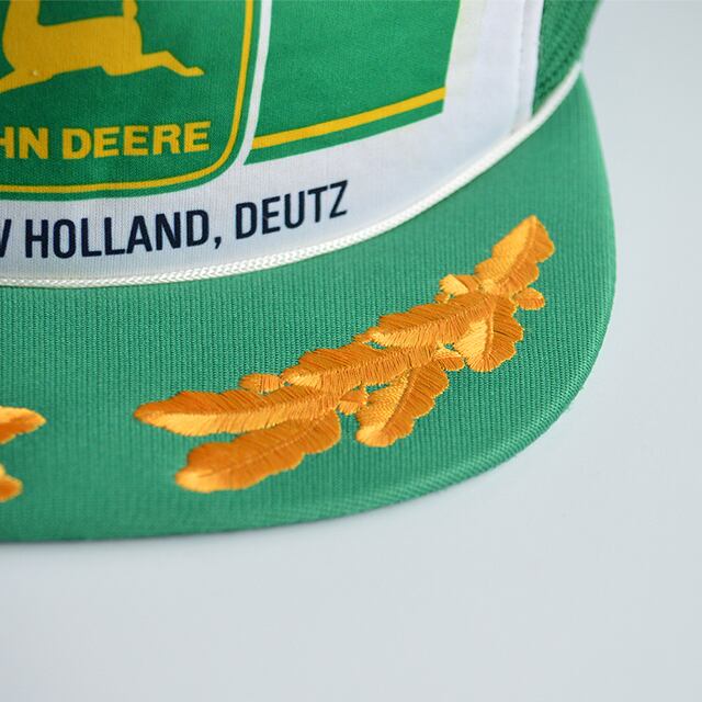 90sのジョンディアのメッシュキャップです。 ツバに刺繍の入ったアポロキャップとも呼ばれるタイプ。 トラクターと同じ緑に黄色の好配色です。 素材:100%POLYESTER SIZE 頭囲 55-60cm 多少の誤差はご了承ください。 CONDITION プリントの横の白い部分に、緑色の色移りのようなものがあります。 多少の着用感はありますが、目立った汚れやダメージはなく、概ね状態良好です。