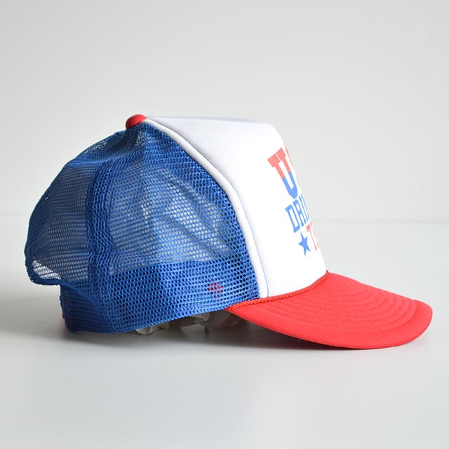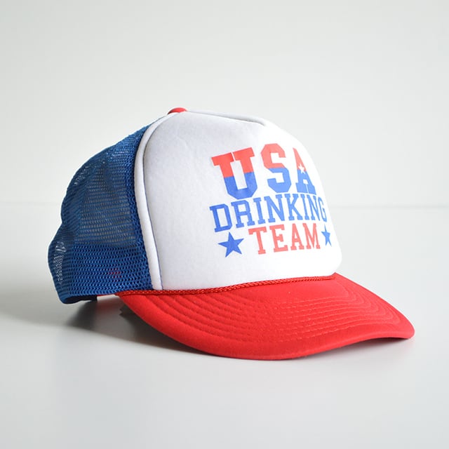 90sのメッシュキャップです。 USA DRINKING TEAMというロゴやカラーリングなど、アメリカらしさ溢れるアイテム。 ボディはCOBRAです。 素材:100%POLYESTER SIZE ONE SIXE FITS ALL 頭囲 56-61cm 多少の誤差はご了承ください。 CONDITION 着用感は少なく、目立った汚れやダメージもない良い状態です。