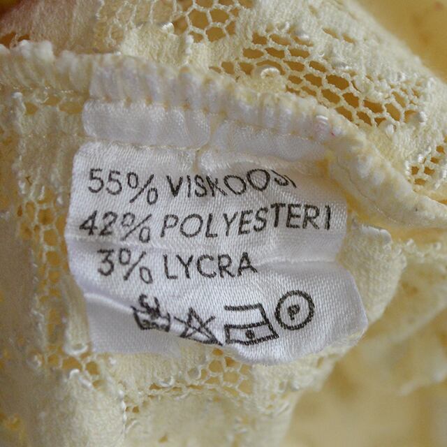 80年代のレースカットソーです。 表記はありませんが、おそらくフィンランドの古着。 レースとしては伸縮性があり、少し重いです。 素材:55%VISKOOSI 42%POLYESTERI 3%LYCRA SIZE 40(着用感レディースS相当) 着丈 45cm 身幅 47cm 肩幅 38cm 袖丈 22cm 多少の誤差はご了承ください。 CONDITION 多少の着用感はありますが、目立った汚れやダメージはなく、概ね状態良好です。