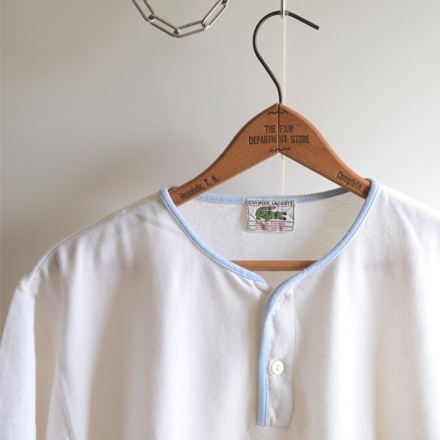 フランス製のラコステ、通称フレラコのヘンリーネックシャツです。 70年代、80年代頃のアイテム。 素材:PUR COTON SIZE 表記なし(着用感メンズXL相当) 着丈 77cm 身幅 55cm 肩幅 45cm 袖丈 22cm 多少の誤差はご了承ください。 CONDITION 腹部に薄い汚れやシミがあります。 右袖に小さな汚れが三つあります。 形が少し崩れており、着用感は強いですが、古着慣れしている方でしたら問題なく着れる状態です。
