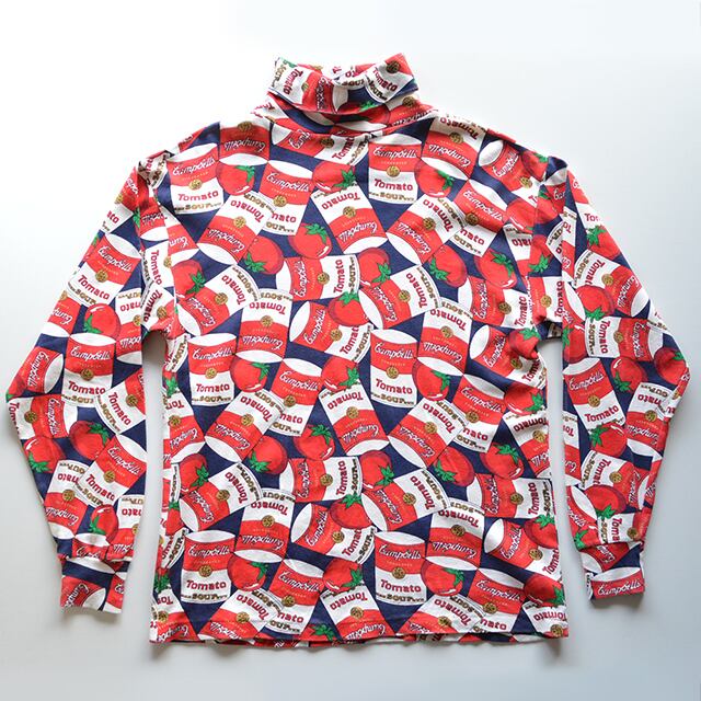 キャンベルのトマトスープの総柄のタートルネックカットソーです。 90年代のアイテムです。 素材:100%COTTON SIZE L 着丈 71cm 身幅 55cm 肩幅 56cm 袖丈 61cm 多少の誤差はご了承ください。 CONDITION 左袖に目立たない染みがあります。 着用感はありますが、年代を考慮すると概ね状態良好です。