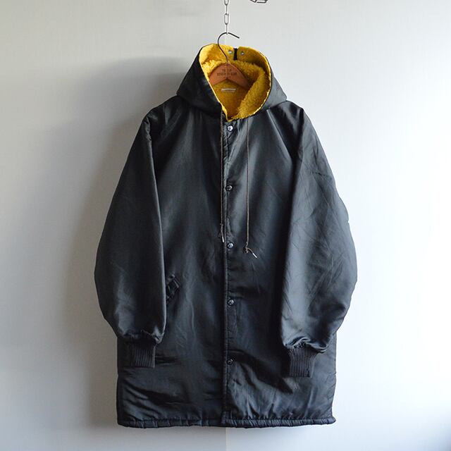 80sのベンチコートです。 ボディはコーチジャケットで有名なBirdieのUSA製。 裏地は身頃がボア、袖がキルティングで保温性はなかなか、それでいて重たくはないので、着用しやすいです。 その他、黒無地、リブ、割れるフードなどが特徴です。 SIZE S 着丈 84cm 身幅 58cm 裄丈 83cm 多少の誤差はご了承ください。 CONDITION 軽い伝線やシワなどの、多少の着用感はありますが、大きな傷みはなく、概ね状態良好です。