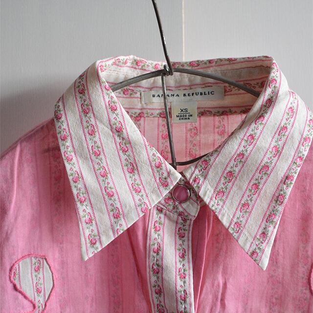 バナナリパブリックのウエスタンシャツです。 小花柄のストライプ、ボディと同じピンク色のスナップボタンが特徴。 生地はかなり薄めです。 素材:50%POLY 50%COTTON SIZE XS 着丈 55cm 身幅 44cm 肩幅 37cm 袖丈 58cm 多少の誤差はご了承ください。 CONDITION 着用感はありますが、目立った汚れやダメージはなく、問題なく着れる状態です。