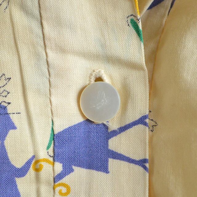50sのプリントシャツです。 車を押す女性の総柄。 ウエストタック、貝ボタン、胸のパイピング、ポケット付きなどが特徴。 素材はおそらくコットンです。 SIZE 表記なし(着用感レディースS相当) 着丈 54cm 身幅 45cm 肩幅 36cm 袖丈 21cm 多少の誤差はご了承ください。 CONDITION 目立たない薄いシミが多数あります。 多少の着用感はありますが、古着慣れしている方でしたら問題なく着れる状態です。