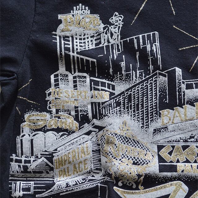 80sのラスベガスTシャツです。 ピエロやカウガール、銀色のきらきらしたプリントが印象的なカジノ柄。 ボディはCaribeです。 素材:50%COTTON 50%POLYESTER SIZE M 着丈 60cm 身幅 42cm 肩幅 40cm 袖丈 19cm 多少の誤差はご了承ください。 CONDITION 胸部にシールをはがしたような跡があります。 着用感は少なく、目立った汚れやダメージもない良い状態です。