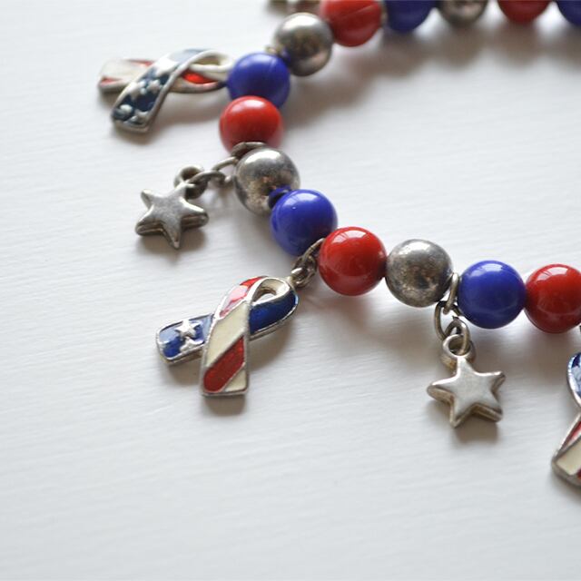 星条旗のリボンや星のチャーム、カラーリングなど、アメリカらしさ溢れるブレスレットです。 80年代のアメリカのアイテム。 アメリカ好きな方に。 SIZE 内周《ゴム入り》 16.5cm 多少の誤差はご了承ください。 CONDITION 多少の傷やくすみはありますが、年代を考慮すると概ね状態良好です。