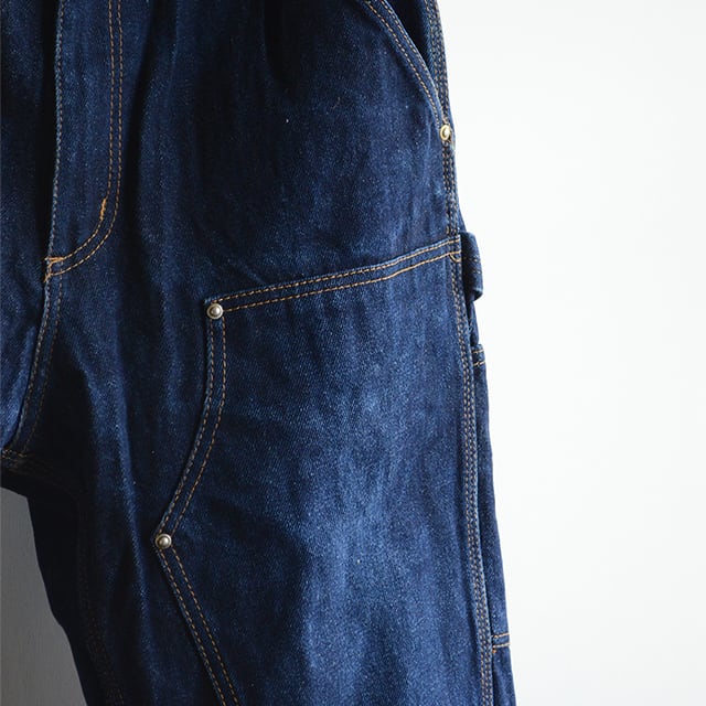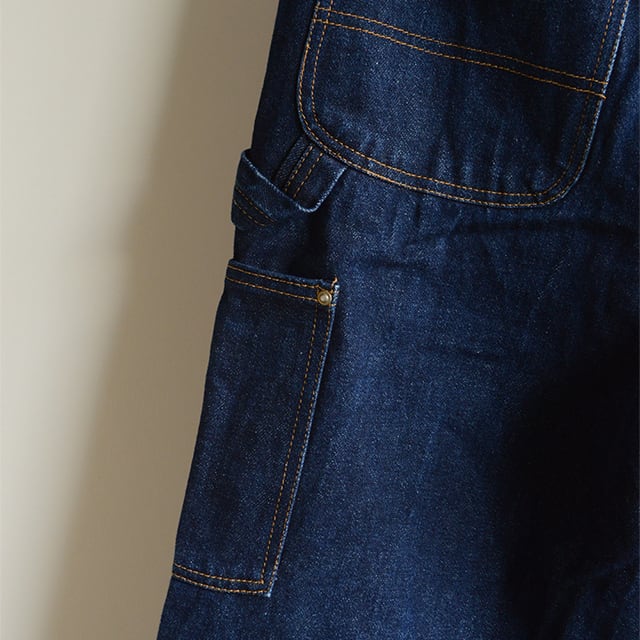 サイドはトリプルステッチ、リベットはUFO、ダブルニー、サスペンダーボタン付き。